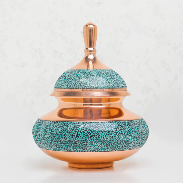 This turquoise inlaid container is a practical and decorative lidded bowl crafted from copper and genuine turquoise stones. Available in two sizes, it is finished with four layers of protective polyester coating for enhanced durability and shine. Its elegant appearance makes it suitable for both everyday use and interior decoration. It comes in refined packaging, making it gift-ready.