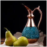 This turquoise inlaid pitcher is a fine representation of Persian craftsmanship, made from copper and decorated with natural turquoise stones. The four protective layers of polyester coating enhance its shine and durability. As each piece is handmade, slight variations may occur, adding to its authenticity. The product is shipped within 3 to 5 business days.